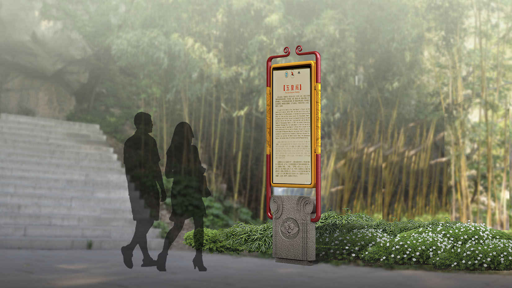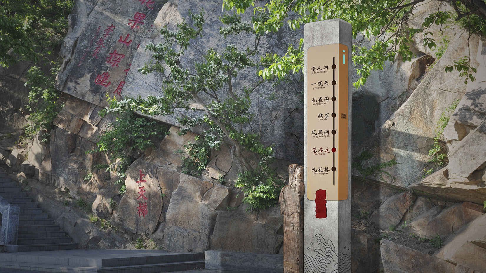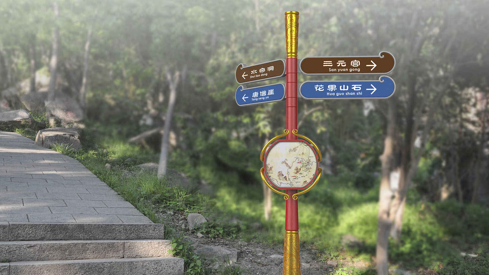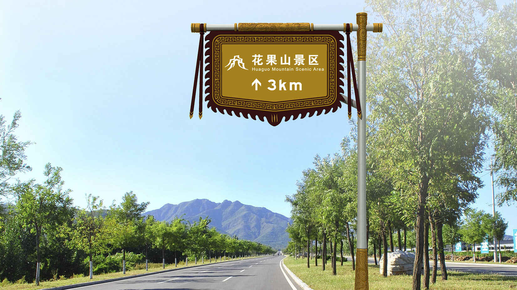 视域承担花果山景区的导向系统、服务设施系统规划设计导则编制工作,旨在提高花果山景区的服务质量、景区的特色和活力,为建设符合花果山5A级景区整体形象的导向标识系统及公共服务设施系统提供相关指导。方案设计以金箍棒为主要设计灵感,端头的纹饰采用了筋斗云,增加回形纹的点缀,体现景区特色。