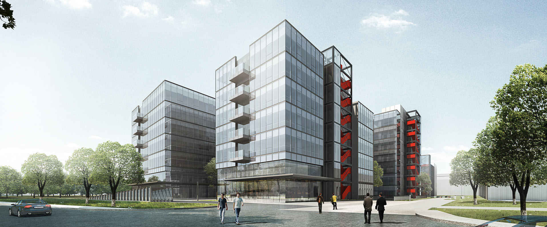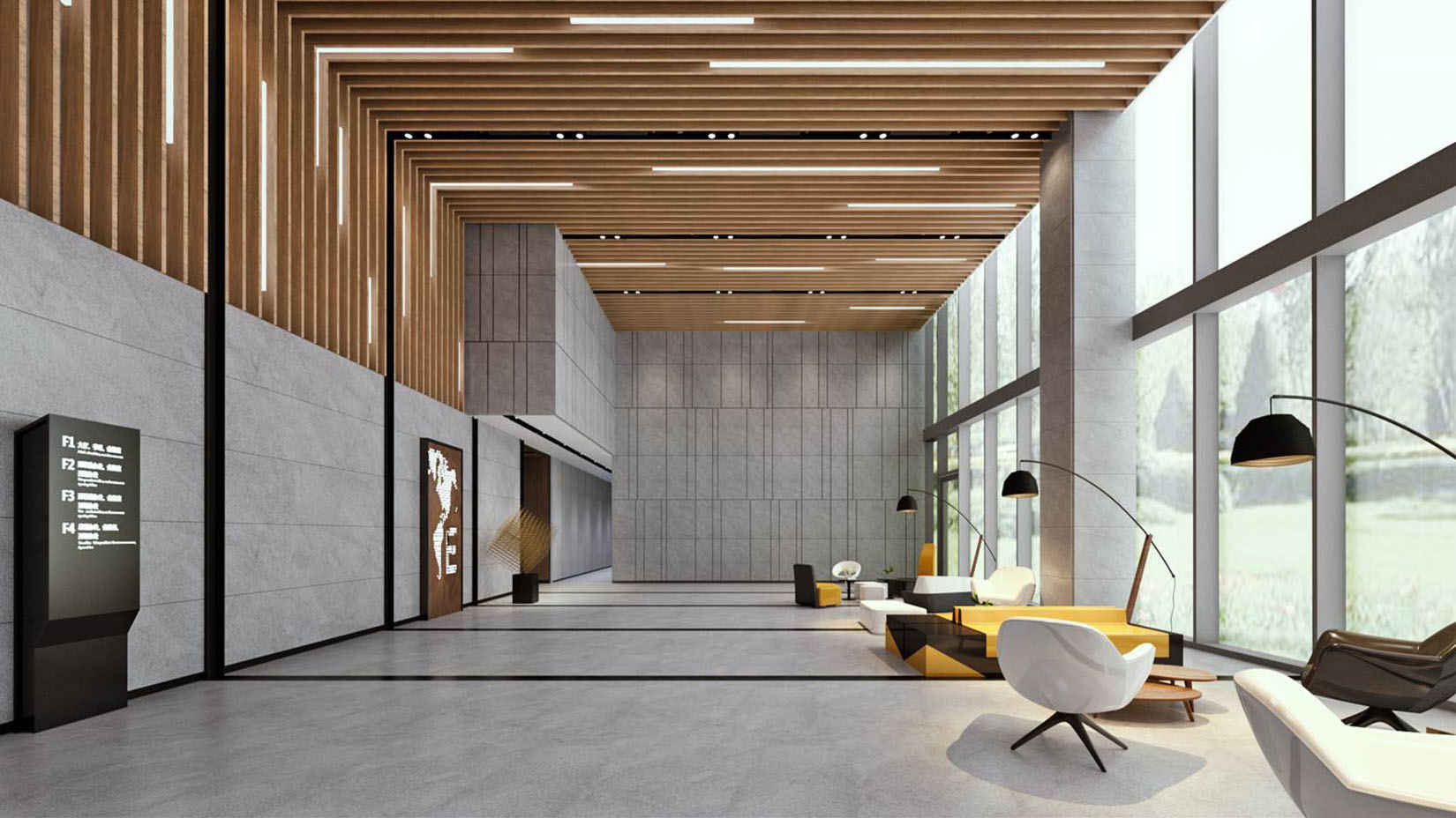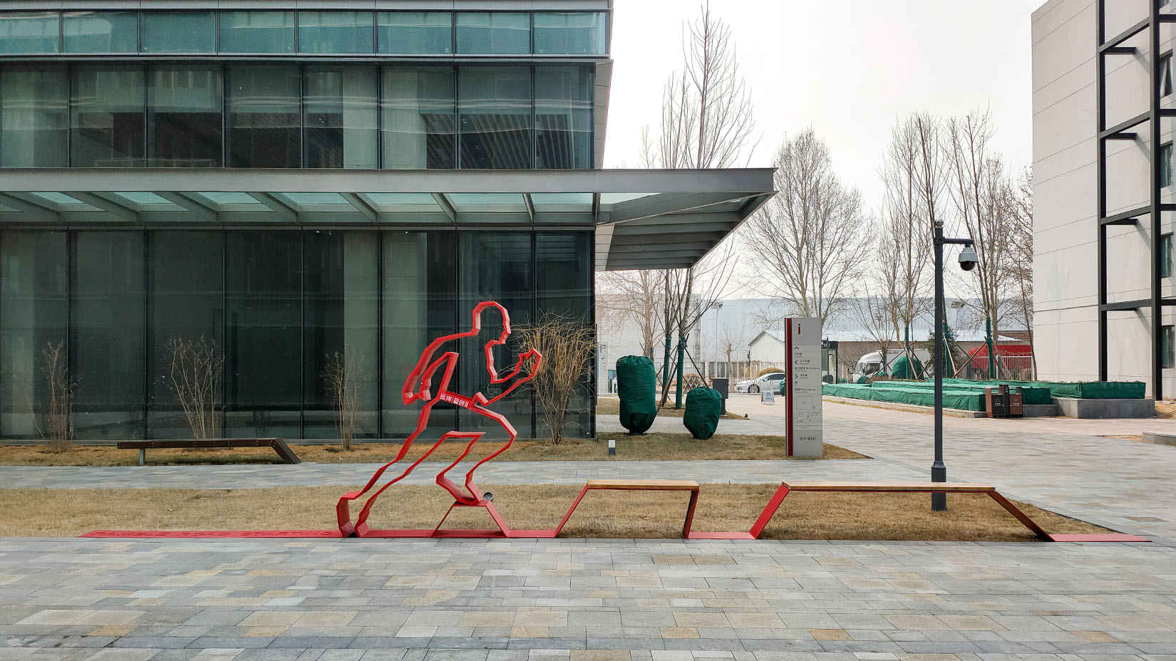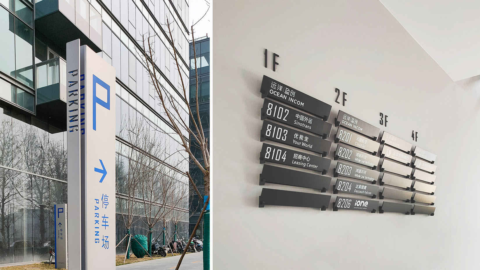 视域承担远洋盈创健康产业园的导向系统规划设计工作,提取建筑的体块分割穿插特征,演变为层次丰富且相互环抱的造型设计,同时将最具特点的红色外挂楼梯颜色用于标识主色,使标识与整体空间和谐统一,将工业风、生态化和品质感完美融合。