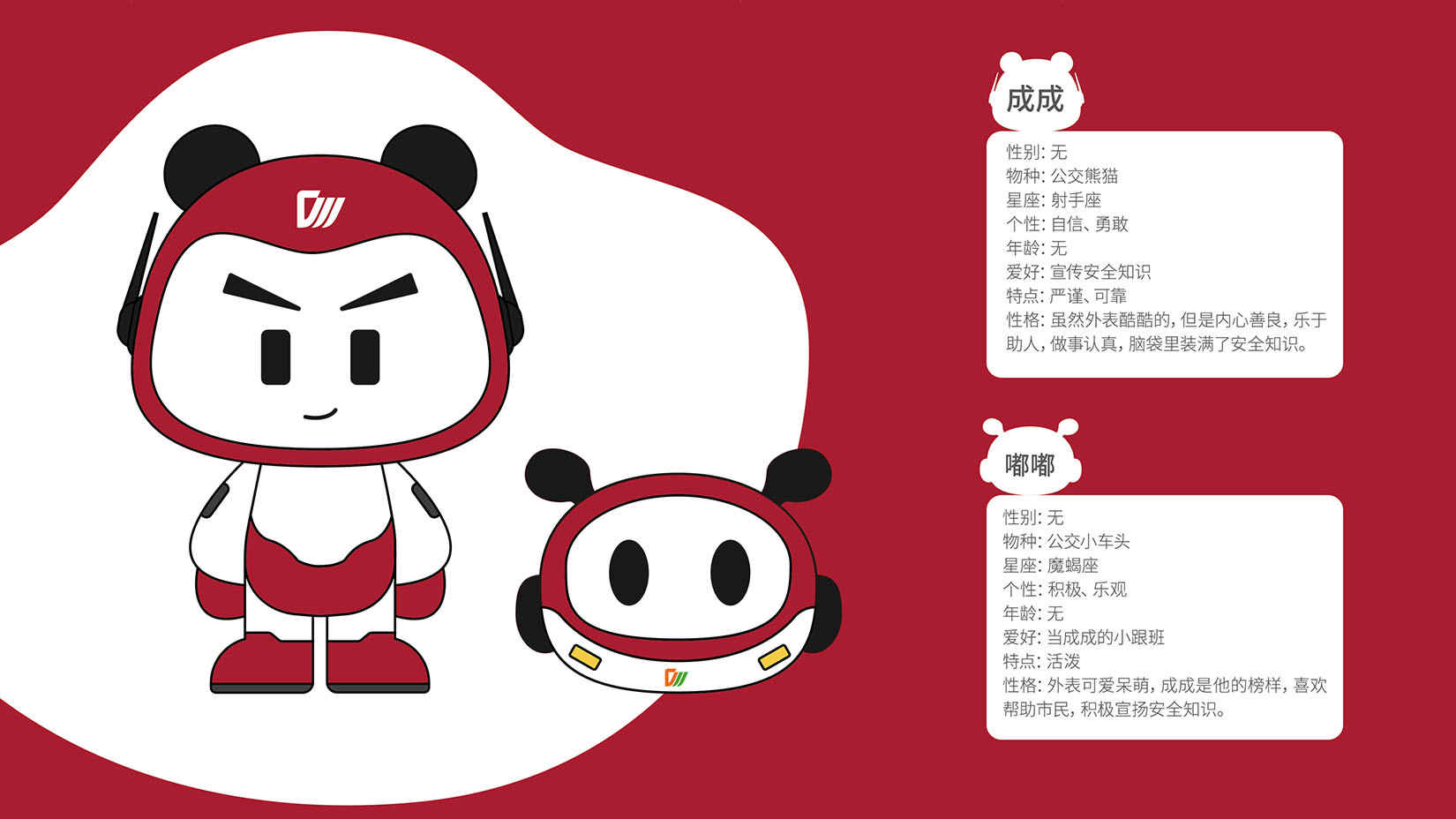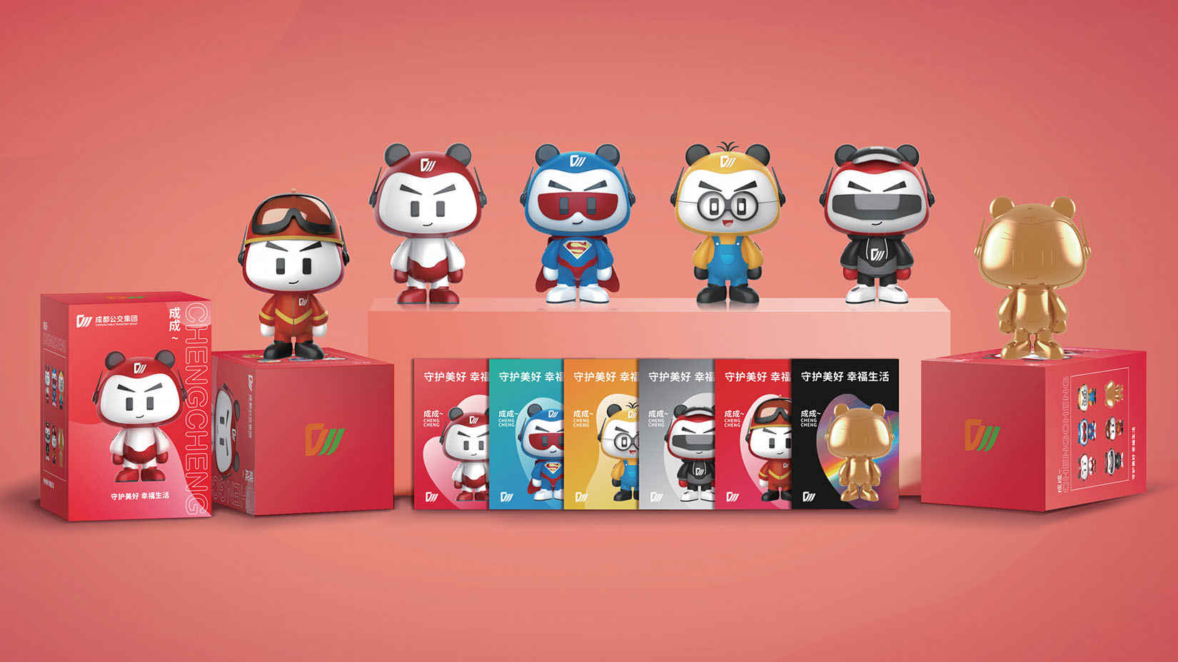 视域承担成都公交集团品牌IP形象优化的设计工作。成都公交集团IP由热爱宣传安全知识的“成成”和热爱帮助市民、积极宣扬安全知识的“嘟嘟”两大形象组成。在设计上,以成都特色熊猫形象呈现“成成”的整体造型,耳朵以明晰的熊猫耳为特征,营造可爱活泼的整体氛围;脸颊两侧的可动性信号接收器由公交车的雨刷器变化而来,额头加印集团品牌标志,彰显品牌身份;表情坚定且自信,寓意成都公交集团全心全意为乘客服务,努力提高市民出行品质的服务理念和愿景。“嘟嘟”的整体造型以一个圆团状的机器形态呈现,圆润的公交后视镜作其耳朵,以小巧的公交车轮贴合整体,更加凸显形象的可爱。