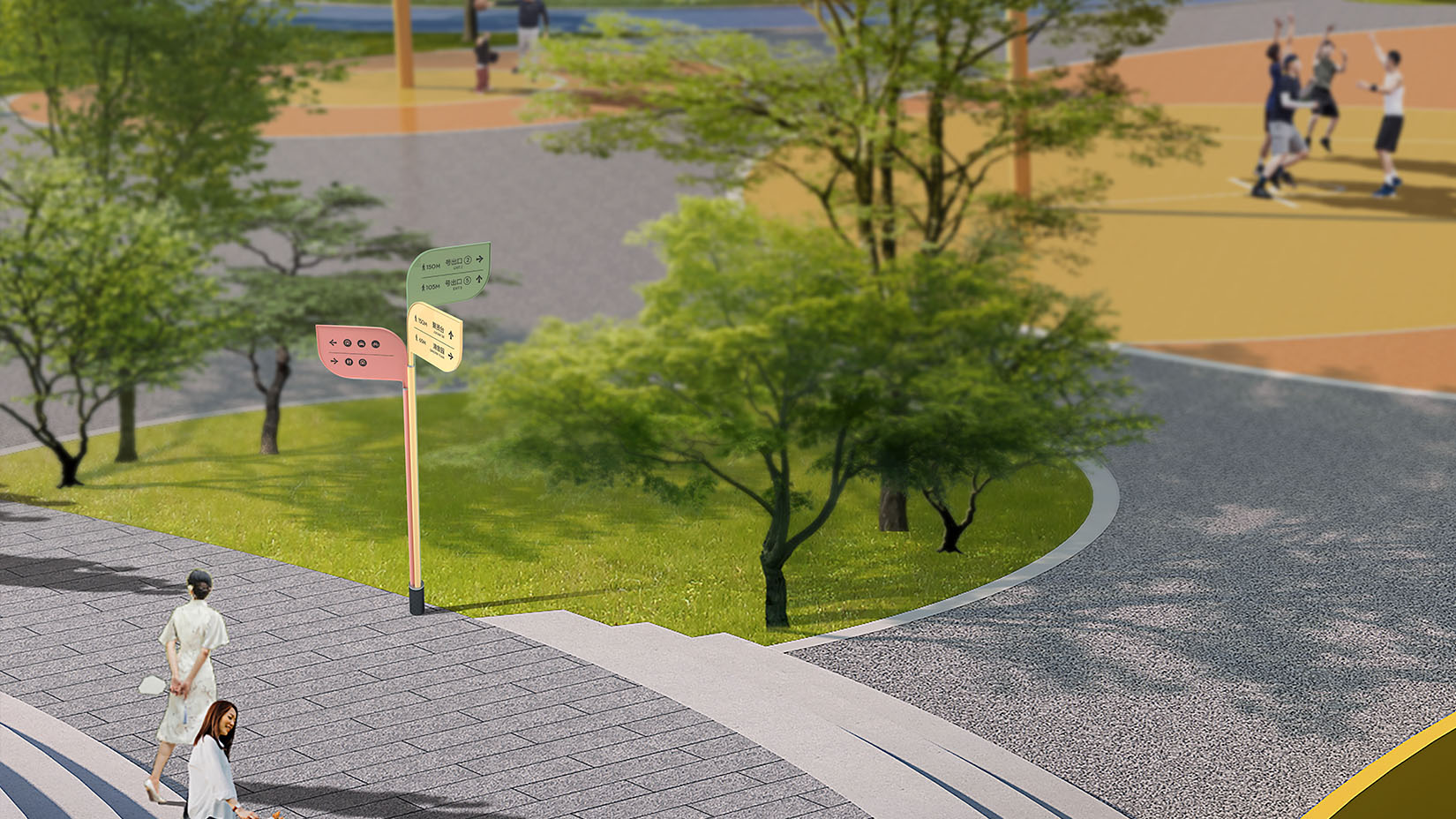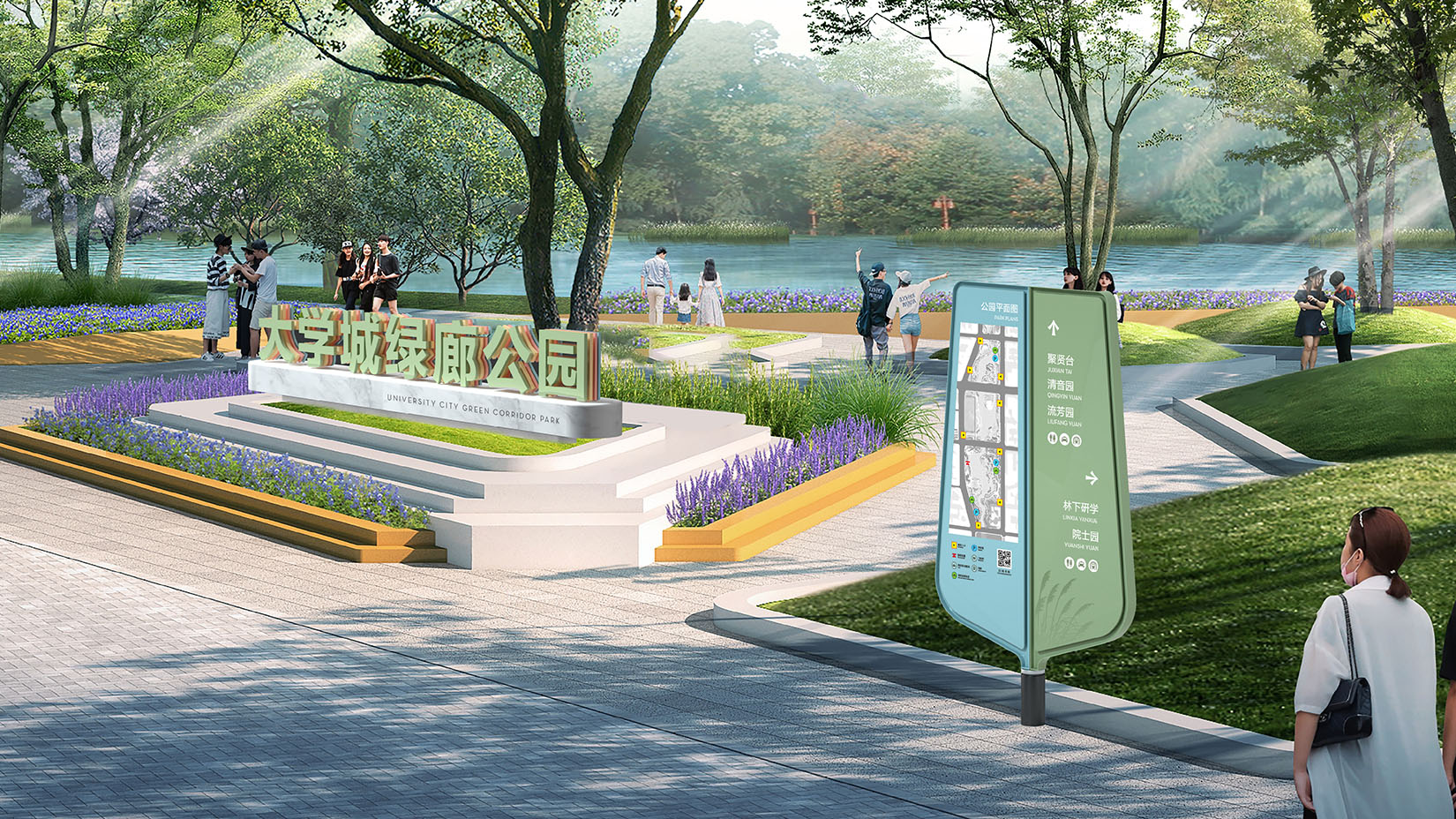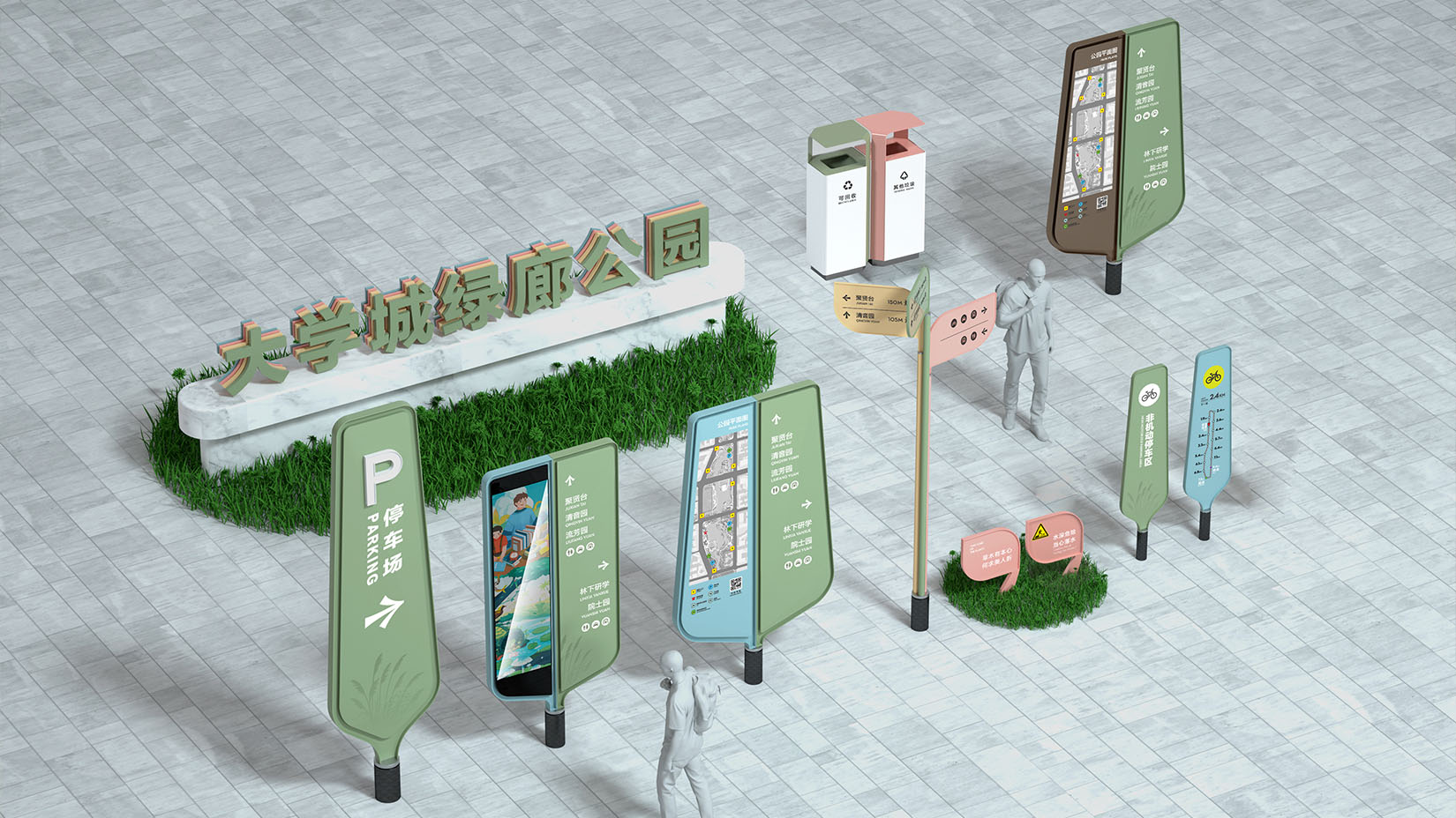 视域承担大学城生态绿廊公园导向系统和街道家具系统的规划设计工作,设计理念深度融合文化韵味、艺术感知与现代简约美学,旨在通过视觉符号实现文化精神的有效传播。创新运用笔画解构重组的手法,通过旋转、变形等现代设计语言,将汉字笔画拆解重构为抽象图形元素,使标识既保留传统书法的神韵,又融入现代极简主义的设计风格。经过艺术化处理的标识,不仅为公园空间赋予了鲜明的文化辨识度,更营造出充满人文气息的沉浸式氛围,实现文化底蕴与空间功能的完美统一。