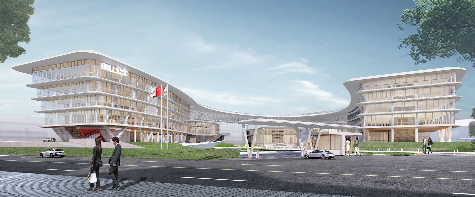 慈溪公牛产业园位于浙江省慈溪市观海卫镇,占地面积约200亩,总建筑面积约 11.6 万平方米,包括行政楼、活动中心、研发楼及员工餐厅等五大核心建筑。建筑设计以“公牛是个动词”为核心理念,从企业形象与愿景中提炼出牛角与V字的设计元素,将力量感与进取精神融入建筑形态,打造兼具高效办公与人文关怀的现代化总部园区。既满足大空间开放式办公的现代需求,又通过优化布局实现全域优良采光,同步配置便捷生活场所,营造舒适的工作环境,为公牛集团量身定制全新的总部生态。