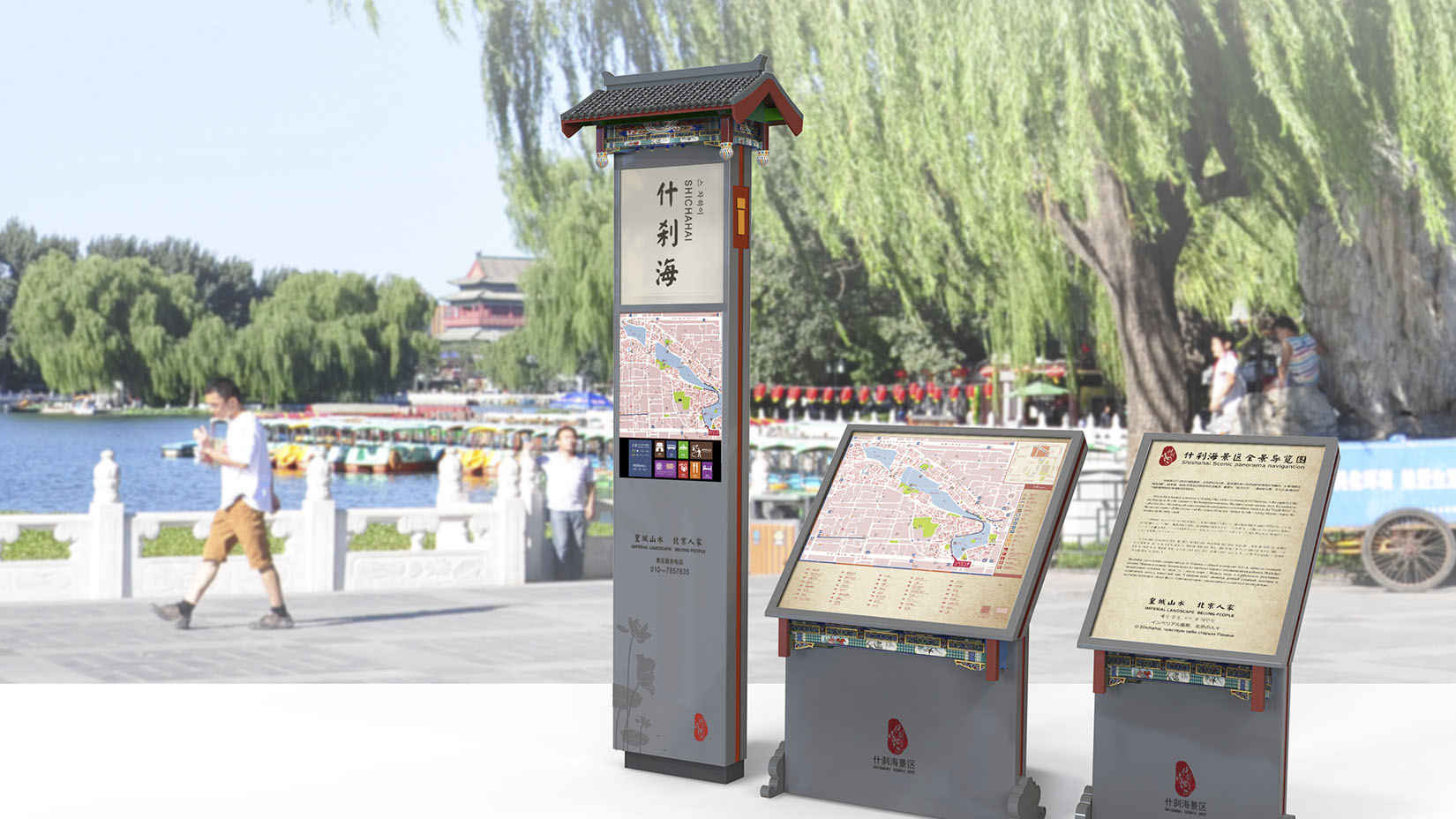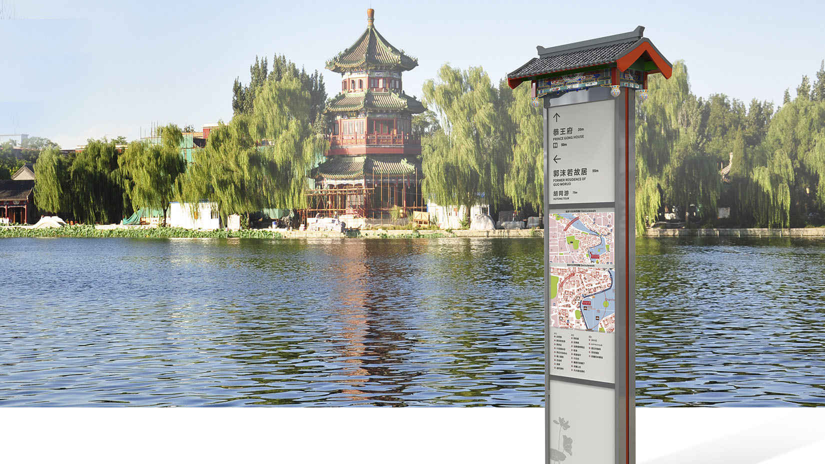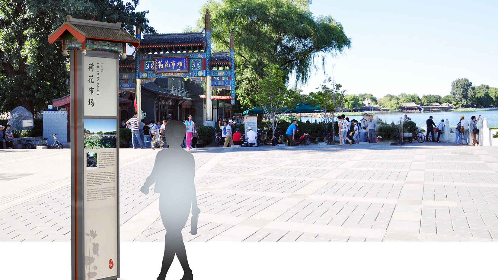 视域承担什刹海景区的导向系统规划设计工作,不仅按照国家5A级旅游景区的标准和要求进行设计规划与建设,同时作为什刹海文化挖掘与数字营销设计的重要组成部分,实现标识与数字媒体应用技术的结合,创造具有文化体验与感知的空间识别系统,最大程度维护什刹海传统风貌,让标识融入环境。