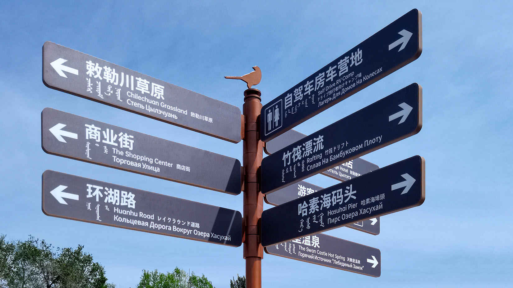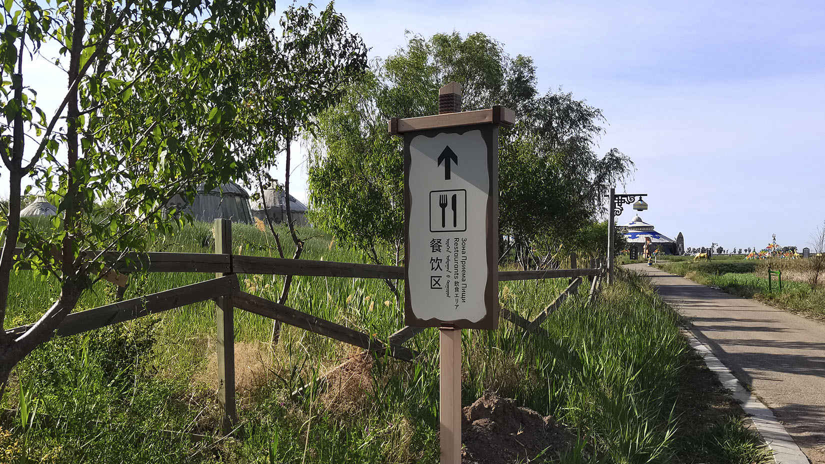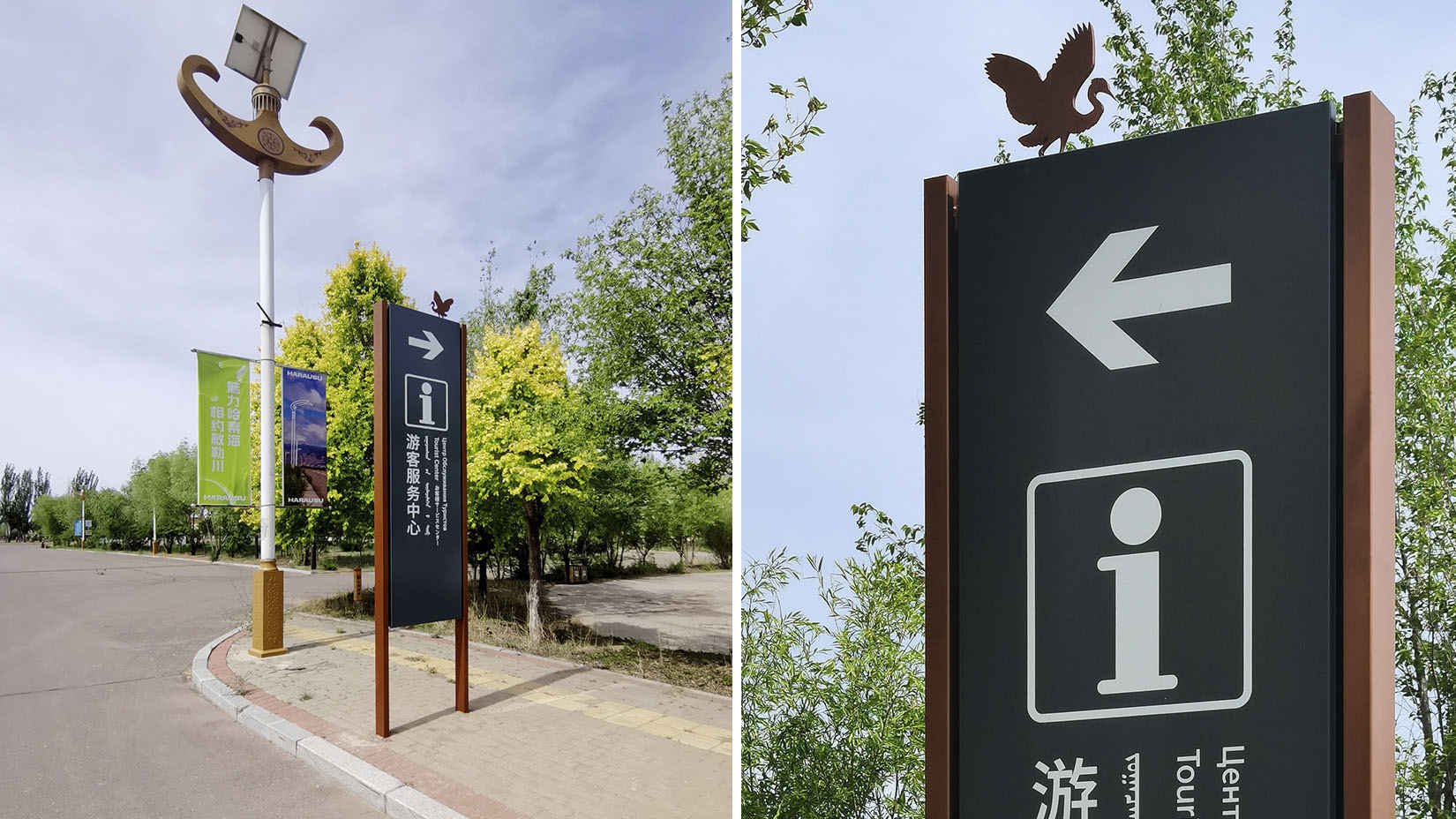 视域承担敕勒川草原文化旅游区的导向系统规划设计工作,草原文化产业园设计融合了草原文化元素进行设计,为游客呈现了具有草原特色的审美形态。草原湿地公园设计元素取于自然,又融于自然,提取延绵的阴山轮廓和荡漾的湖水水纹,略空的飞鸟与随风漫舞的芦花赋予了导向标识本真的灵魂。