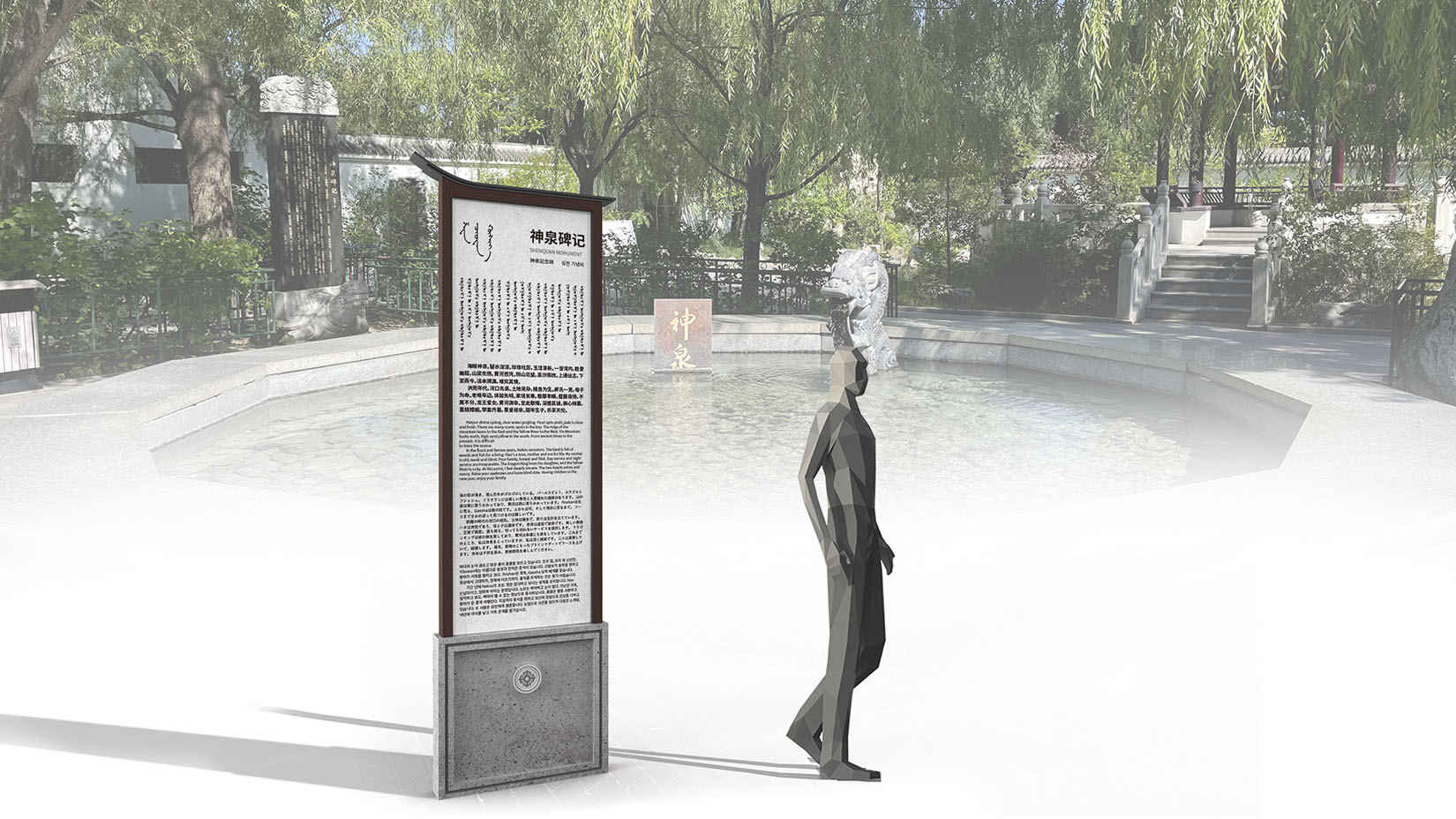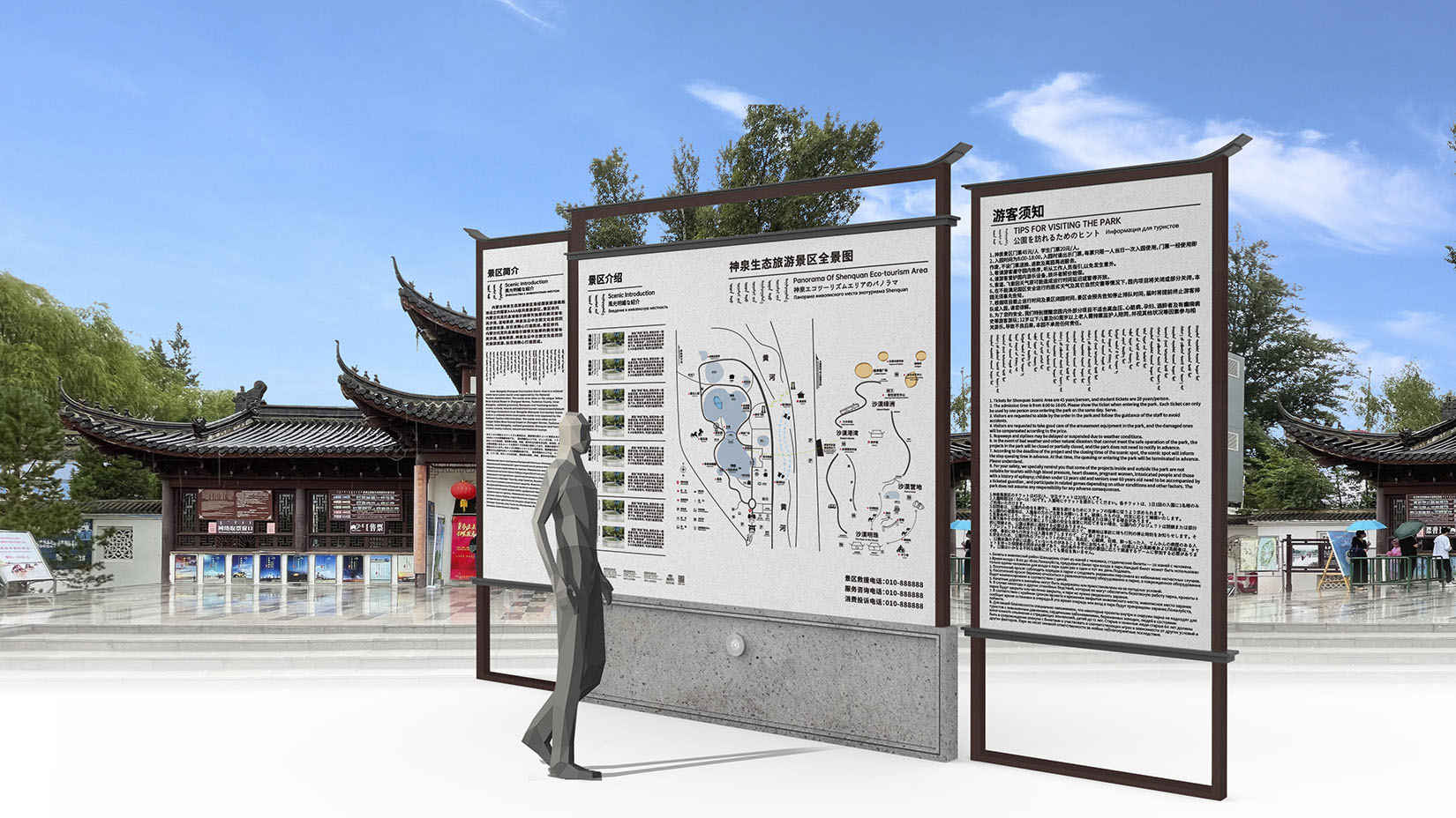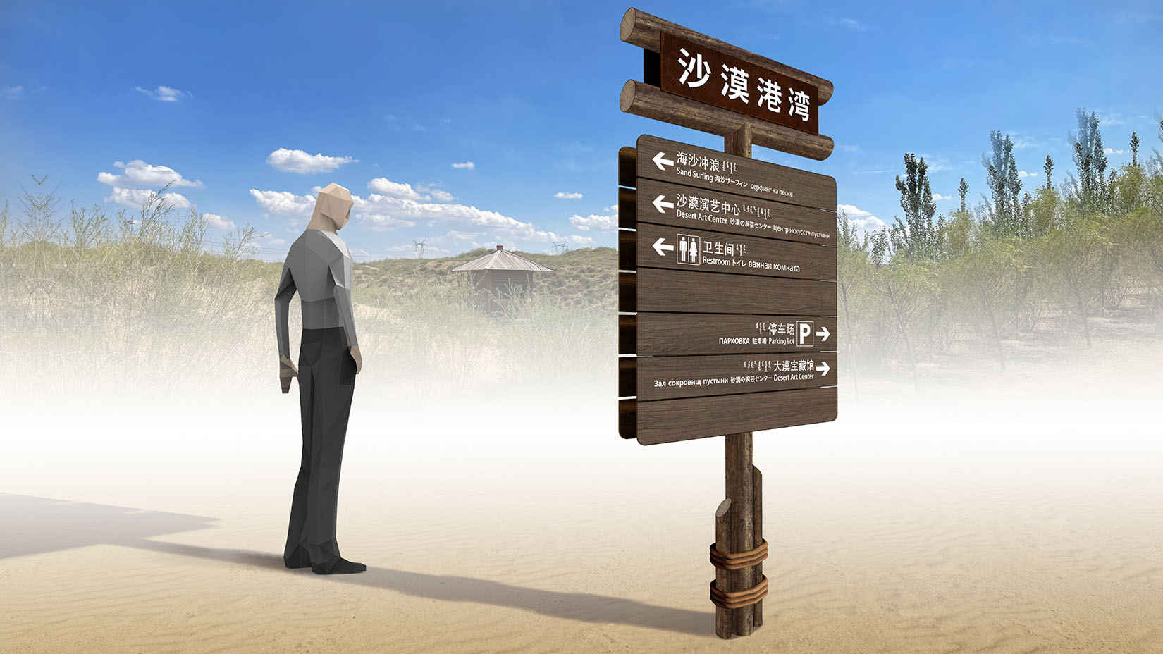 视域承担神泉生态旅游景区的导向系统规划设计工作,景区划分为园林区和沙漠区两个功能分区。园林区以塞上江南为设计理念,运用灰砖白墙的传统江南建筑印象结合红木材质,同时提取檐角建筑特点,与建筑形成呼应。沙漠区还原区域原始属性,合理利用原始木材,更好的融合了独具塞外特色的景观氛围。