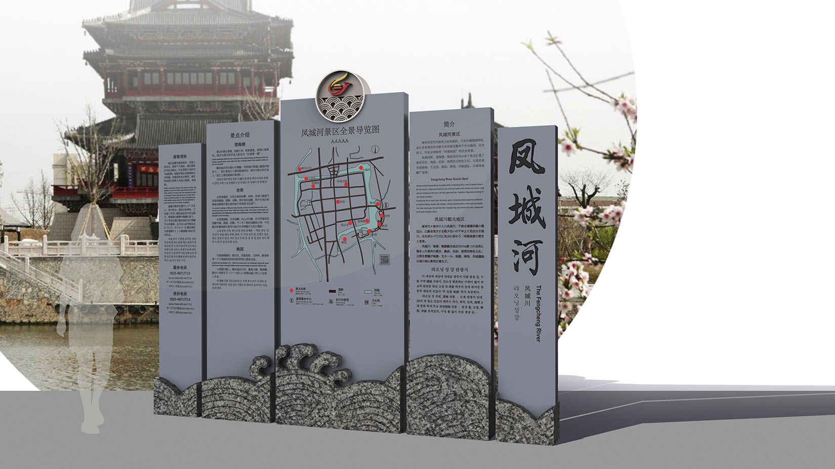 视域承担凤城河风景区的导向系统、服务设施系统规划设计工作,设计为与各功能区域达成一致的设计风格,将各区域的代表形象通过平面设计的手法进行提取,作为设计元素融入到设计之中,让设计效果与区域景观、建筑充分融合、气质统一。