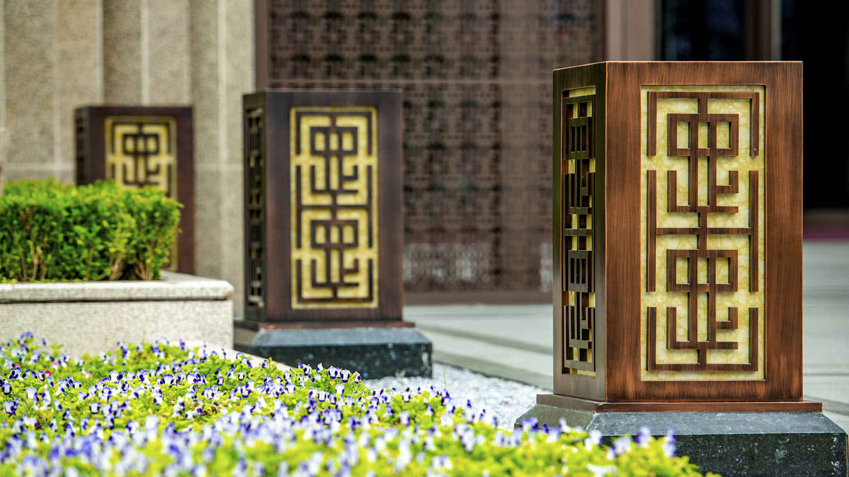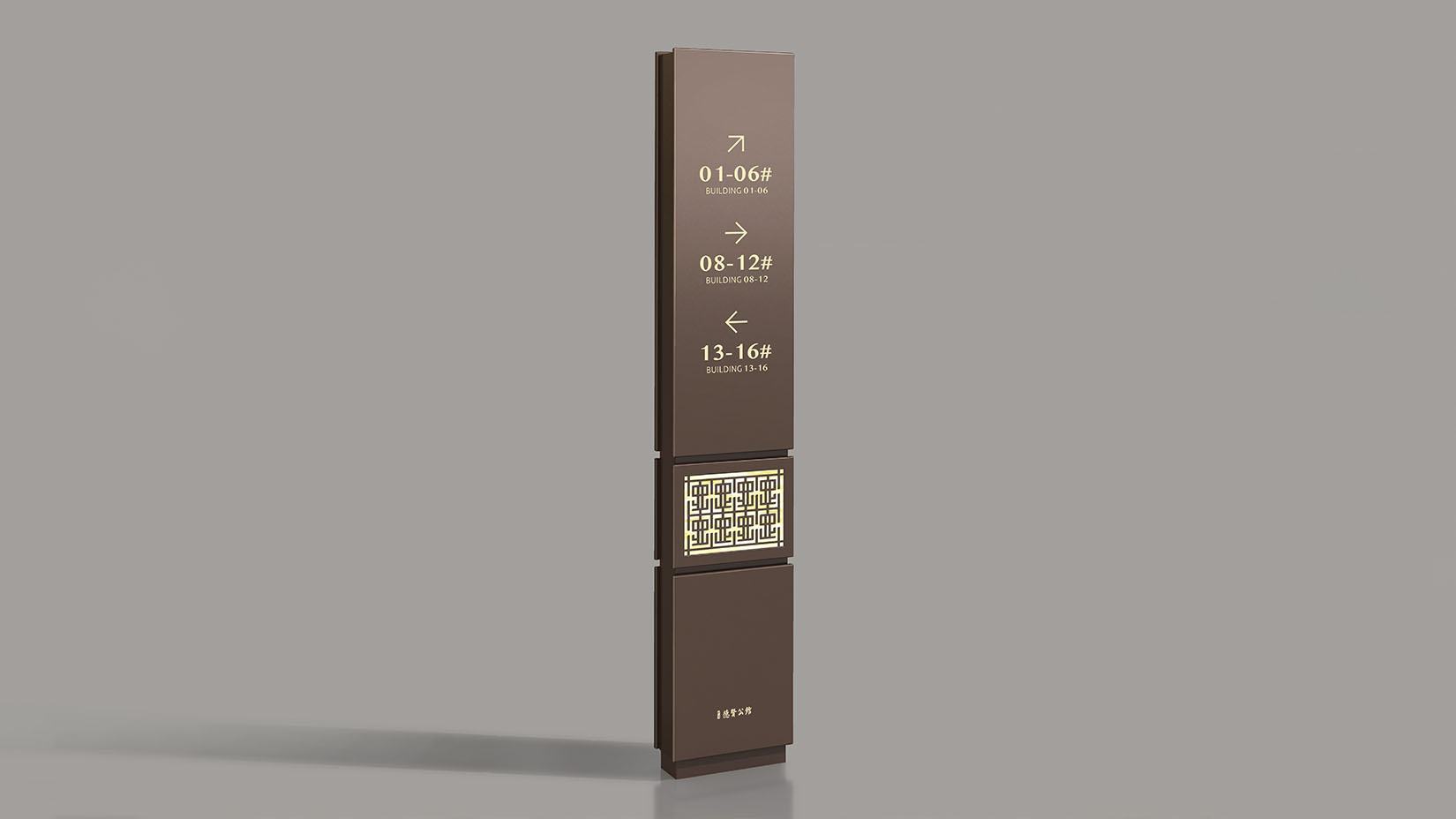 视域承担秦皇岛中冶德贤公馆的导向系统规划设计工作。“东临碣石,以观沧海”,秦皇岛历史悠久,古称碣石,简称秦。设计将“秦”字提取演化为图形符号融入标识,整体造型延续轴线对称的礼序。