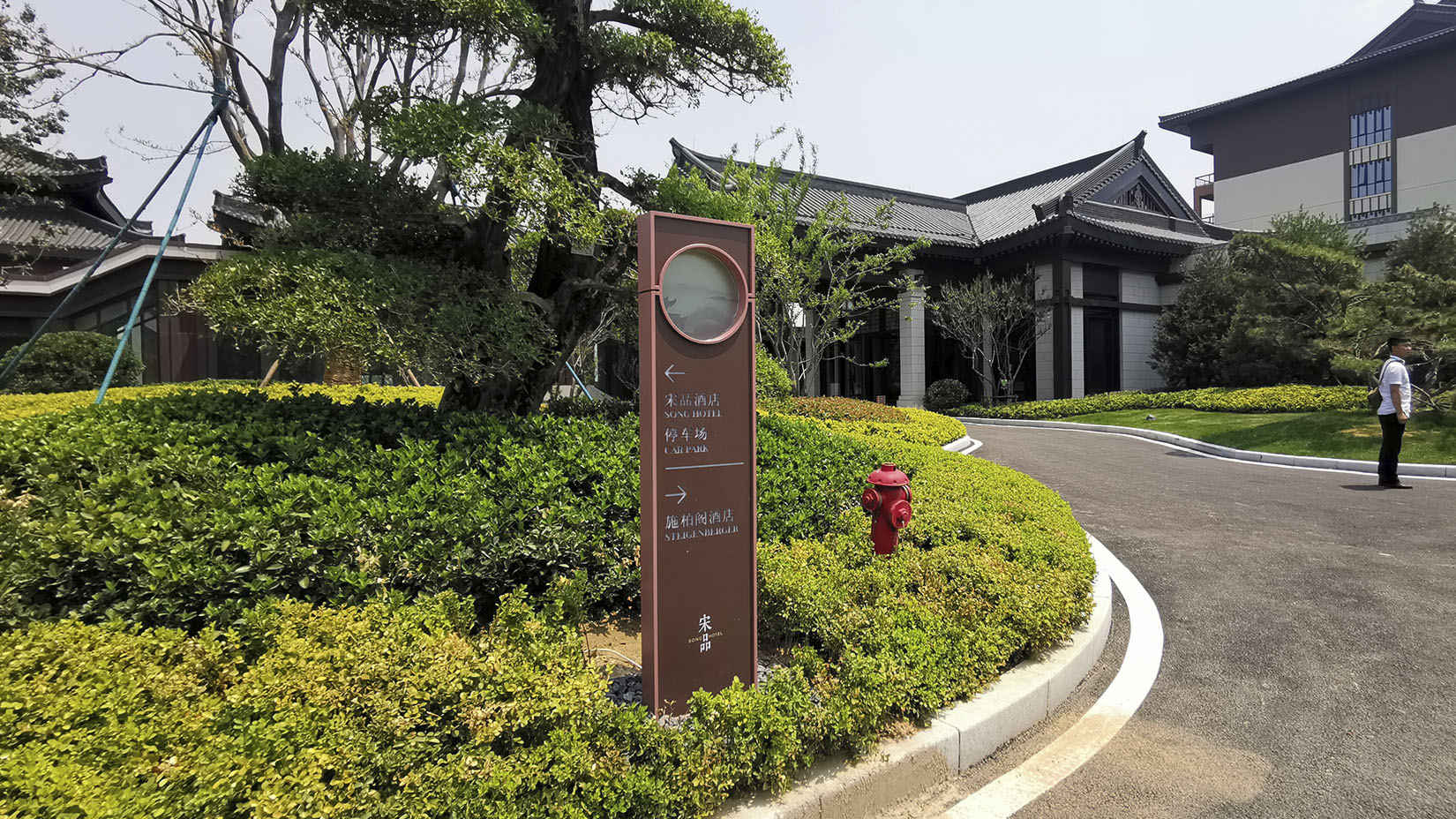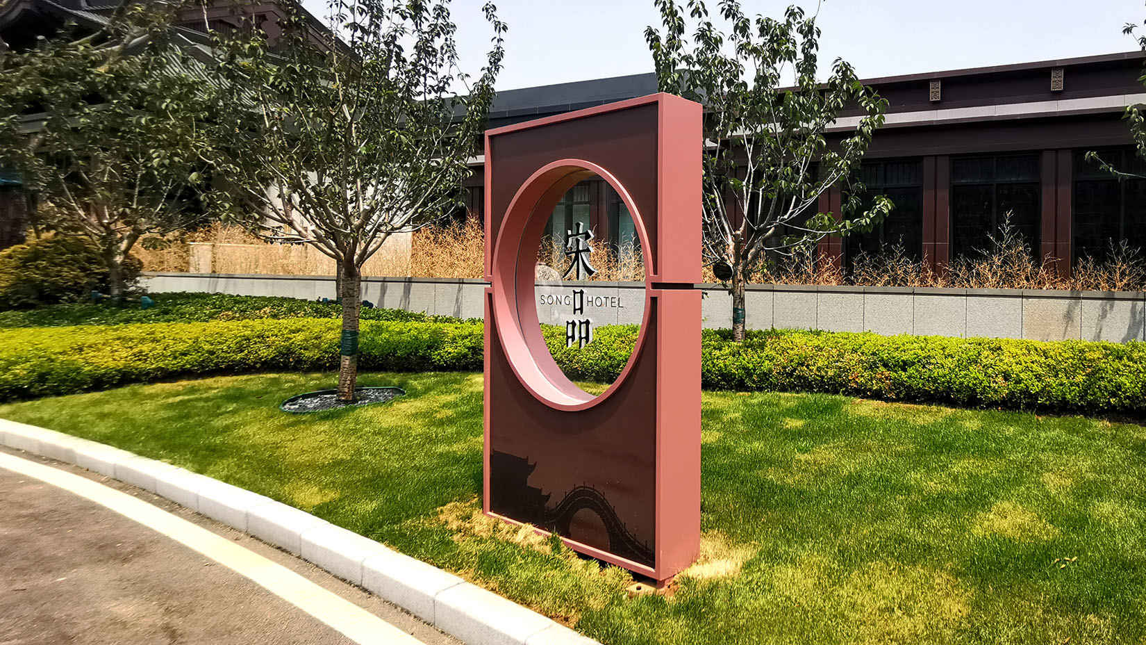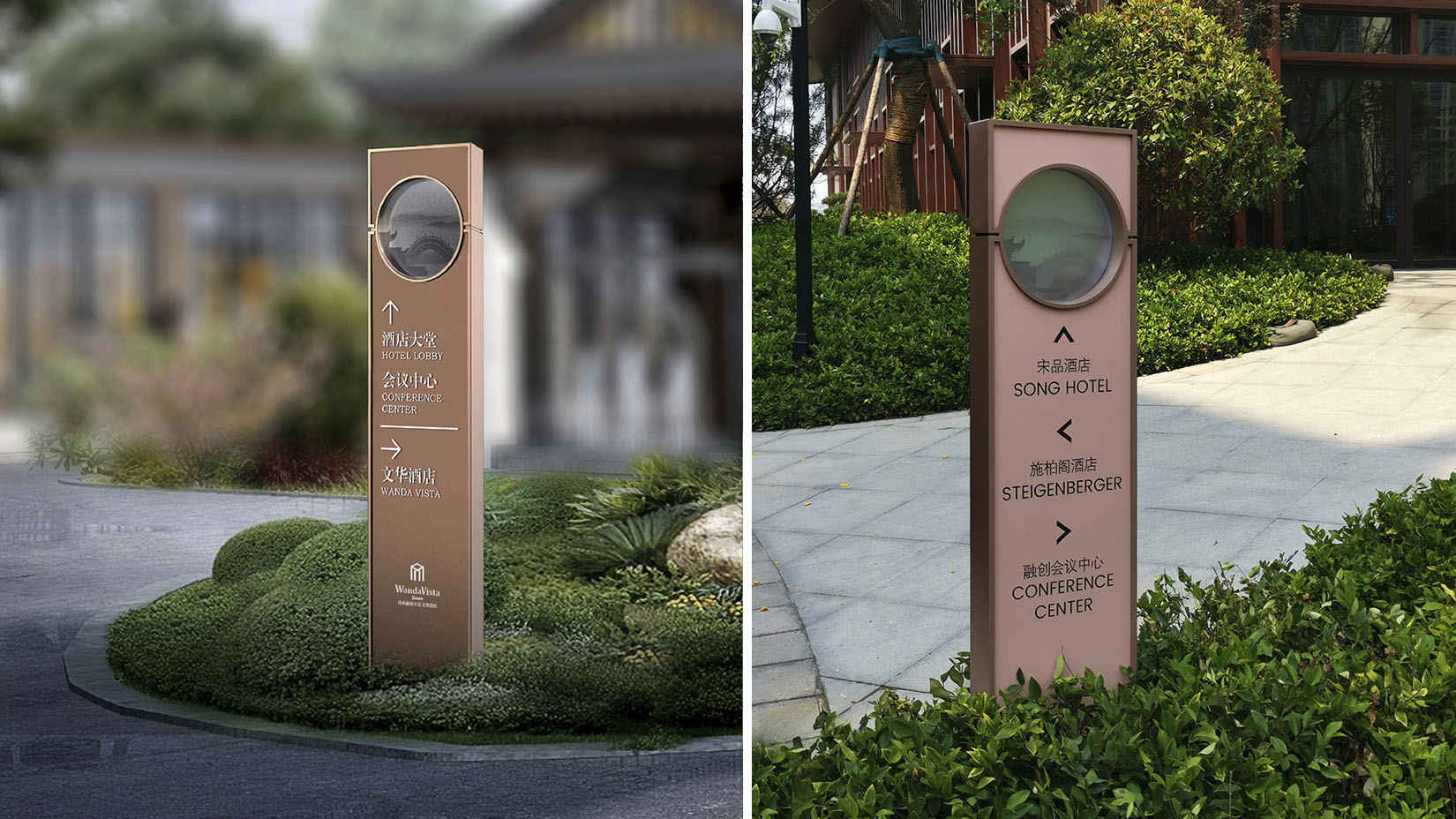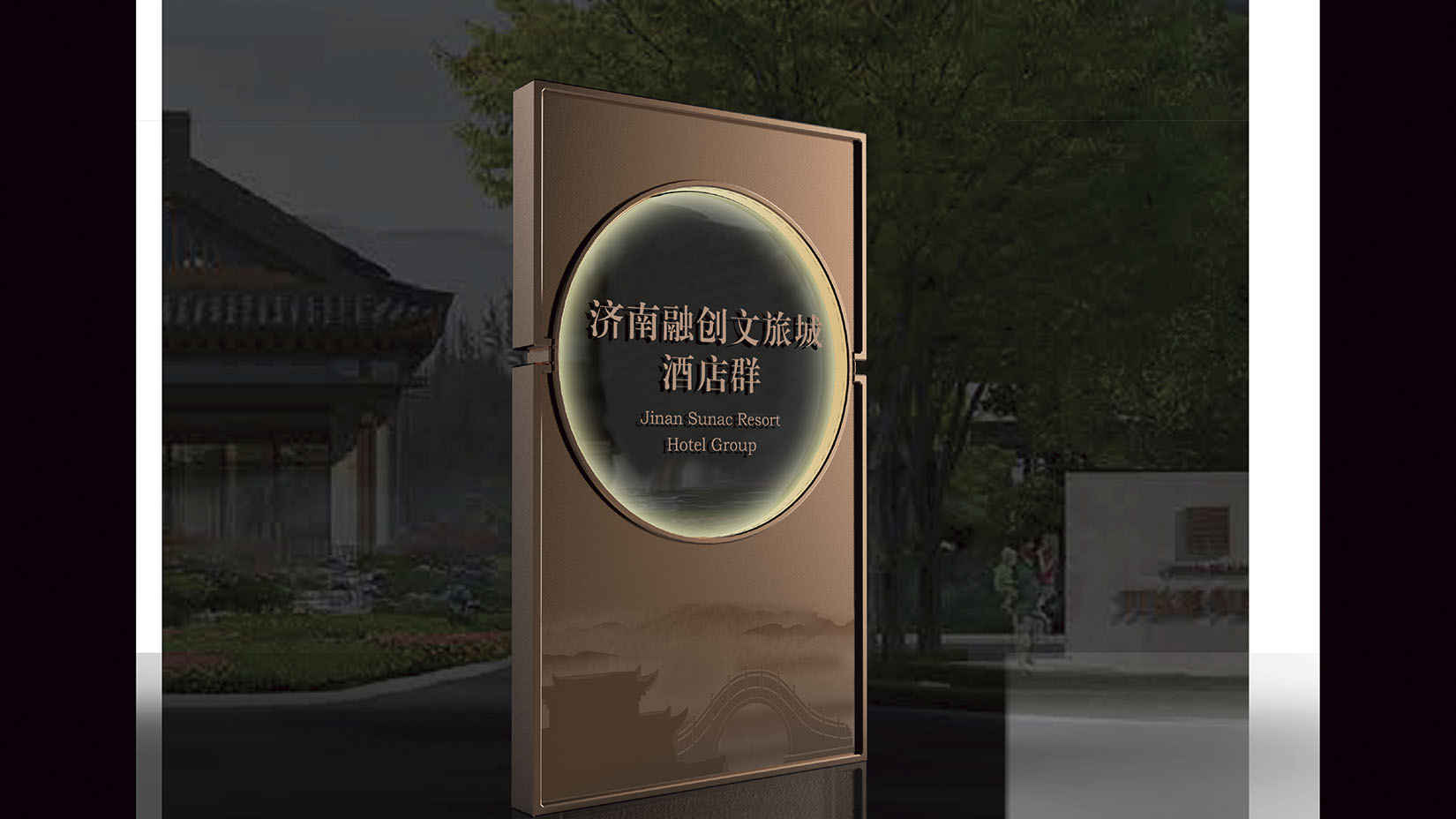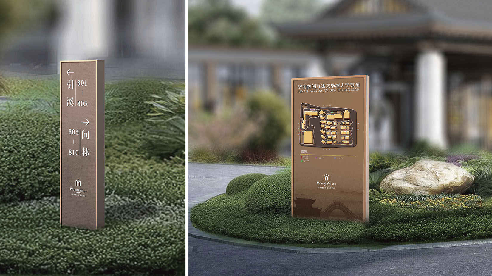 视域承担济南融创文旅城酒店群的导向系统规划设计工作,设计采用古典园林建筑中常用的构景手段之一“借景”,结合当地人文文化,以水墨风融入图案纹理,使整个标识增添中式美学。