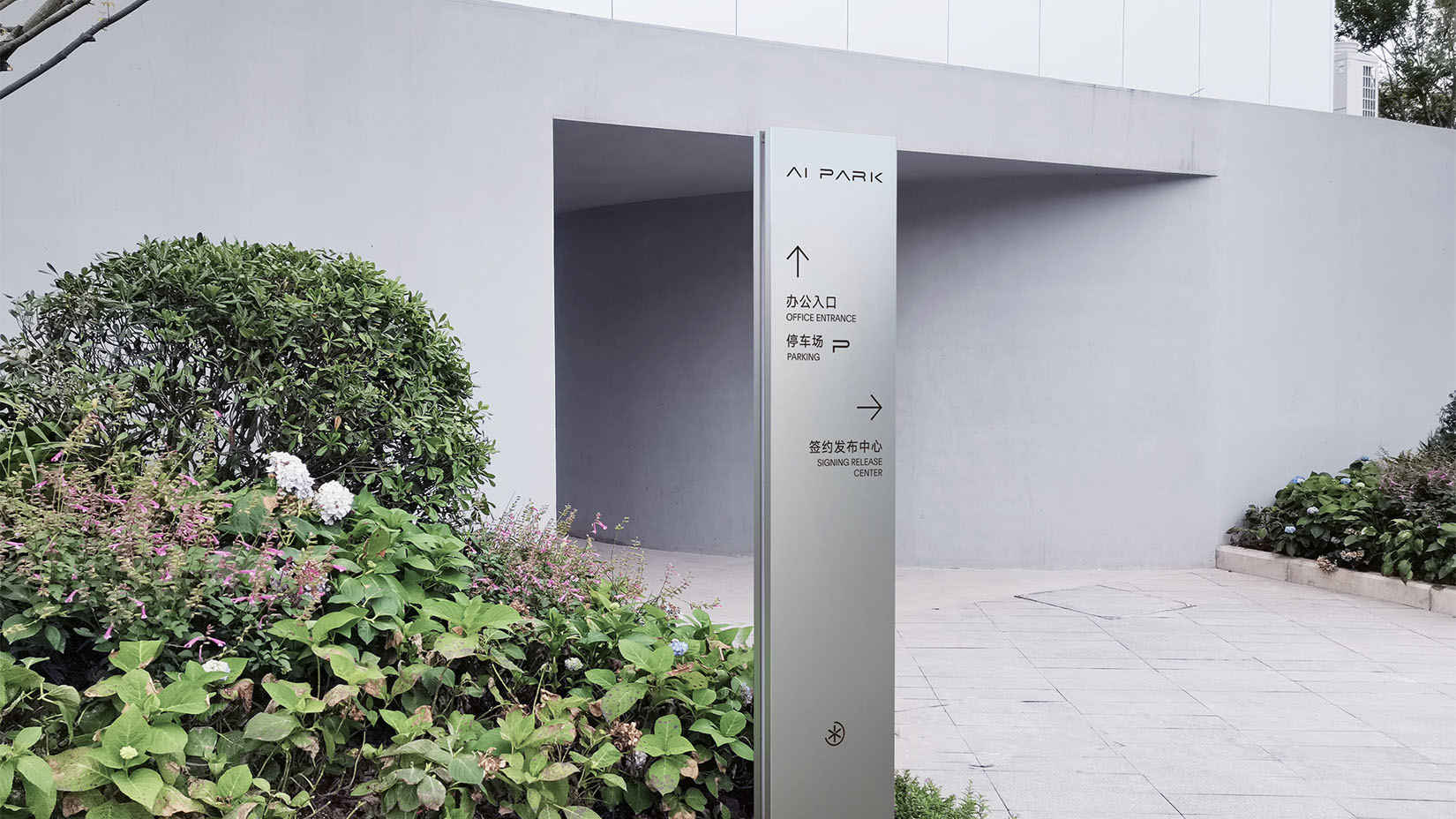 视域承担重庆特斯联AI PARK的导向系统规划设计工作,标识作为体现项目核心特征的视觉焦点,在方寸之间体现科技与自然的结合。从项目的图形设计到标识的现场应用,努力在刚毅和柔美之间取得视觉上的平衡。在建筑立面上,大尺度的AI文字被设计成窗户的一部分,让室外的光线透过AI映照进室内,在保证信息被清晰传达的同时,外观极简且内敛,圆角轮廓和扁平的外观传递亲和、友好,以此向科技带给人们的美好体验致敬。