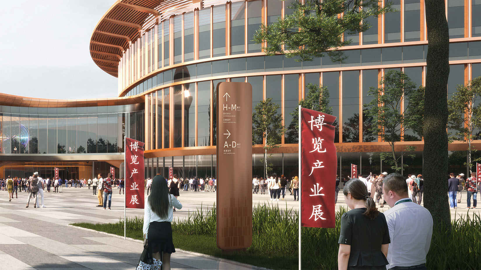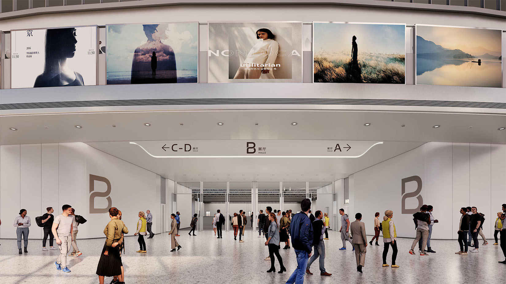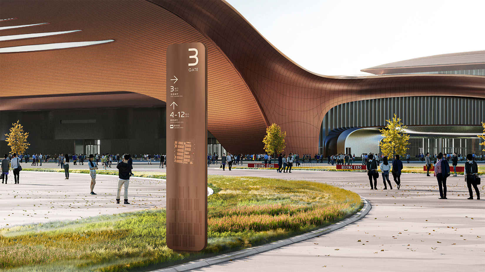 视域承担北京新国展二期的导向系统规划设计工作,设计理念延续建筑语言,巧妙结合中国传统建筑元素琉璃瓦与现代设计符号紫金丝带,营造出一种既富有历史文化底蕴又不失现代感的独特风格。以琉璃瓦其特有的层叠排列形式,展现出“鳞次带比”的视觉效果,通过线条、形状和材质的凹凸变化模拟瓦片的交错排列,赋予标识丰富的深度和动态感。在标识设计中引入丝带元素的曲线线条,与琉璃瓦的层叠结构形成对比与互补,共同构建项目的视觉符号系统。通过对元素的艺术化提炼与创新运用,力求在视觉上达到和谐统一、张弛有度的效果。成功地将传统与现代、静止与流动、秩序与自由等多元特质融为一体,打造出既富含文化底蕴又符合现代审美需求的空间环境,实现了视觉与应用上最舒适的设计状态。