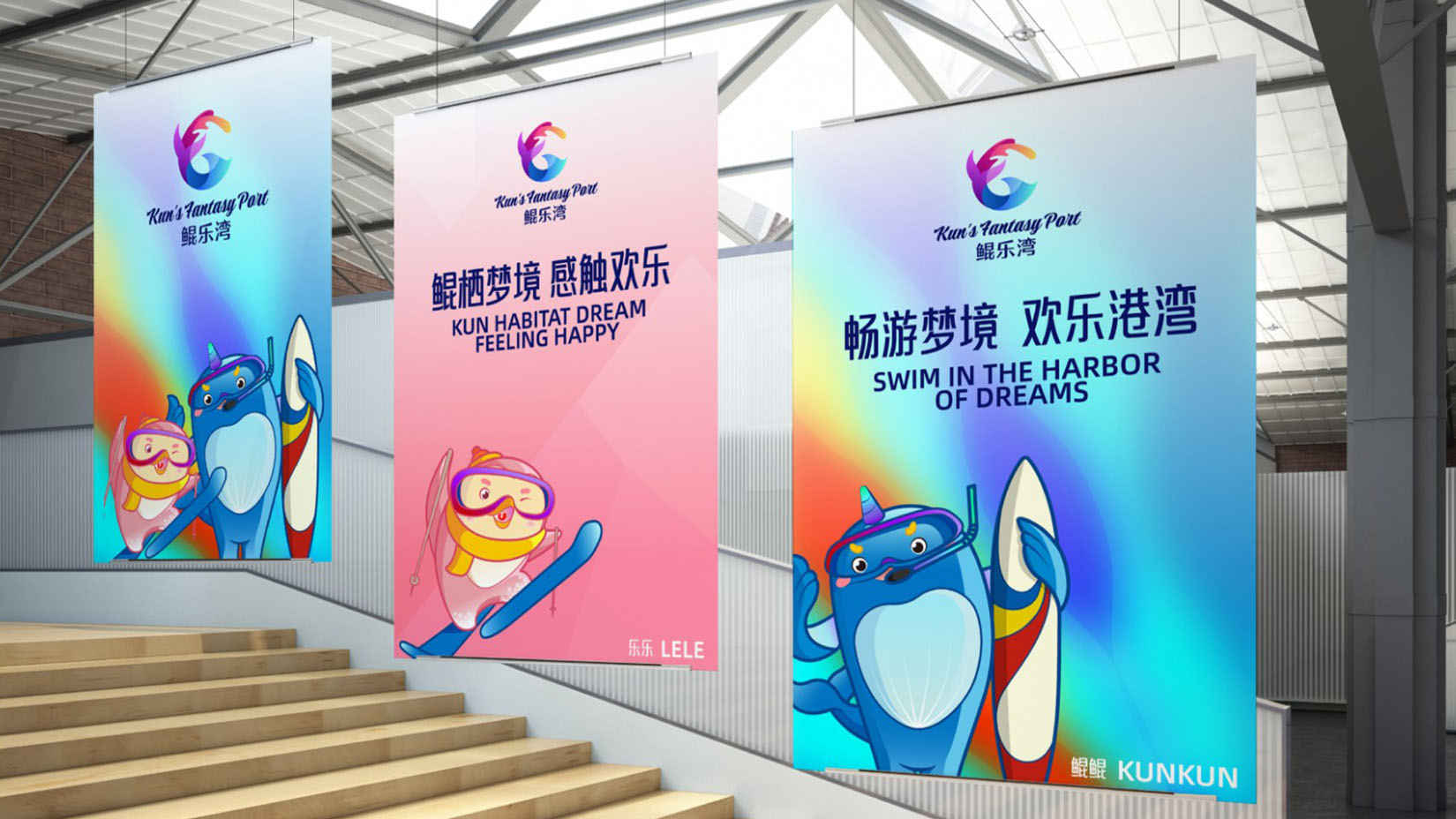 视域参与了邯郸鲲乐湾品牌IP形象的设计工作,选用“鲲”作为IP形象的一个原型,不仅因为它在品牌名称中具有重要的地位,还因为它独特的形象和寓意可以加强消费者对品牌的记忆。通过将“鲲”与品牌名称紧密结合,创造出一个高度统一且易于识别的IP形象,有助于在营销推广中形成强烈的品牌印象。“鲲”在中国文化中象征着广阔和变化,也传达出文旅项目丰富多彩的体验和无限的探索可能。企鹅作为另一个IP原型,其可爱的形象和与冰雪场景的天然联系,强调了鲲乐湾中的冰雪元素。企鹅IP的塑造不仅增加了趣味性,也能直观的传达出项目的特色和主题。通过故事化的表达,增强IP形象与人的情感连接和品牌认同。