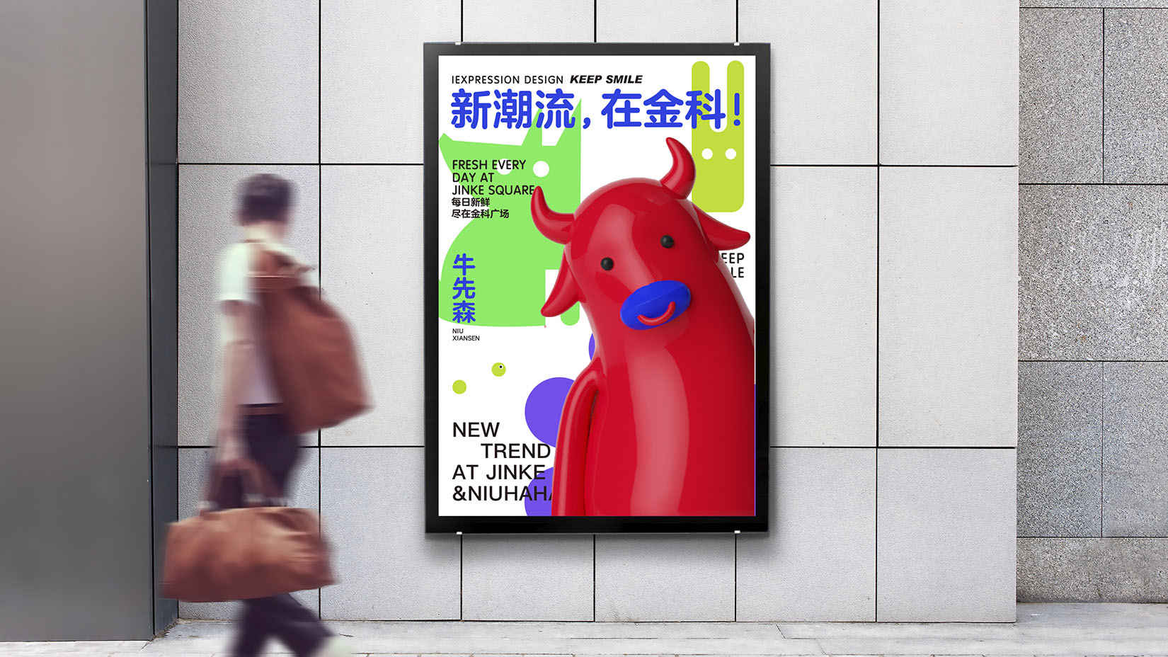 视域承担北京华融新科广场品牌IP形象的设计工作,IP形象设计以牛为原型,代表新科广场金融的行业属性。牛先森以通体红色的形象呈现,鼻子以蓝色点缀,红色代表激情快乐,蓝色代表运动律动,彰显出新科广场街头、潮流的氛围感。牛先森以“牛”的谐音和“牛”的外形寓意了新科广场的NEW状态,迎合了新科广场新地标的定位。