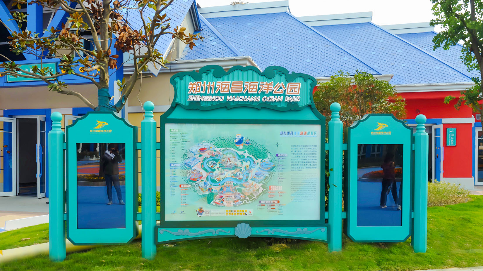 视域承担郑州海昌海洋公园的导向系统规划设计工作,设计以“海洋+极地”为出发点,以蓝绿主调呼应自然,浮岛式建筑元素融入标识造型,海浪纹饰灵动点缀,既与环境浑然一体,又以清晰导视助力访客高效寻路,实现功能与美学的精妙平衡。