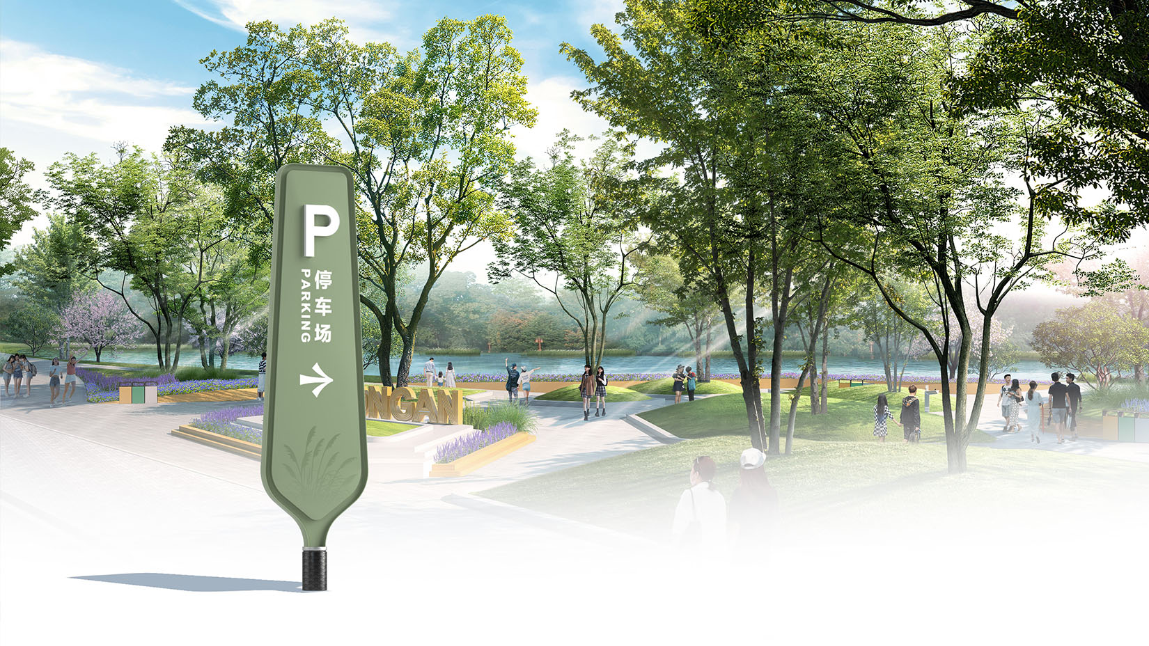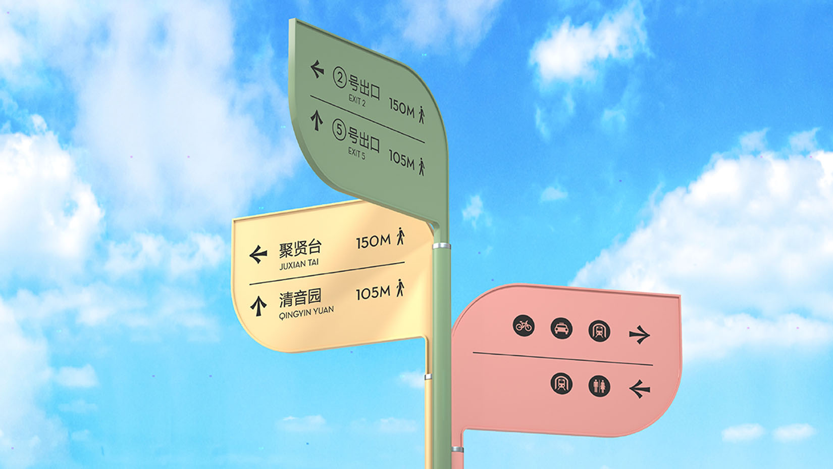 视域承担大学城生态绿廊公园导向系统和街道家具系统的规划设计工作,设计理念深度融合文化韵味、艺术感知与现代简约美学,旨在通过视觉符号实现文化精神的有效传播。创新运用笔画解构重组的手法,通过旋转、变形等现代设计语言,将汉字笔画拆解重构为抽象图形元素,使标识既保留传统书法的神韵,又融入现代极简主义的设计风格。经过艺术化处理的标识,不仅为公园空间赋予了鲜明的文化辨识度,更营造出充满人文气息的沉浸式氛围,实现文化底蕴与空间功能的完美统一。
