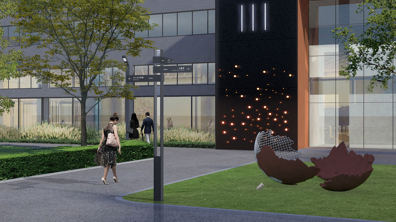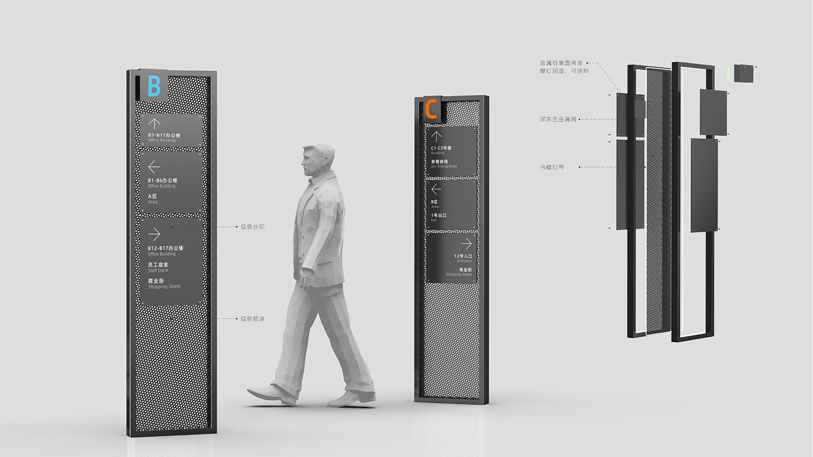 视域承担亲橙空间•高桥云港的导向系统规划设计工作,以“系统性、人性化、生态化”三大理念为核心,融合工业感、通透性与模块化的设计语言,深度契合园区改造历程与复合功能定位。通过提炼原有工业遗存的结构美学特征,结合现代设计手法,构建了一套清晰高效、可持续的标识体系。在功能实现上,模块化设计不仅提升了系统的灵活性与后期维护的便利性,更彰显了园区智慧化与低碳化的运营理念。在色彩策略方面,将A、B、C、D四大分区赋予高识别度的主题色,既保持了视觉统一性,又强化了区域归属感,显著提升了空间指引效率与用户体验。整体导向系统不仅实现了功能层面的清晰引导与信息层级分明的效果,更在视觉表达上延续了园区的工业记忆,以色彩激活空间活力,成功塑造出一个兼具理性与温度、传承与创新的园区新形象。